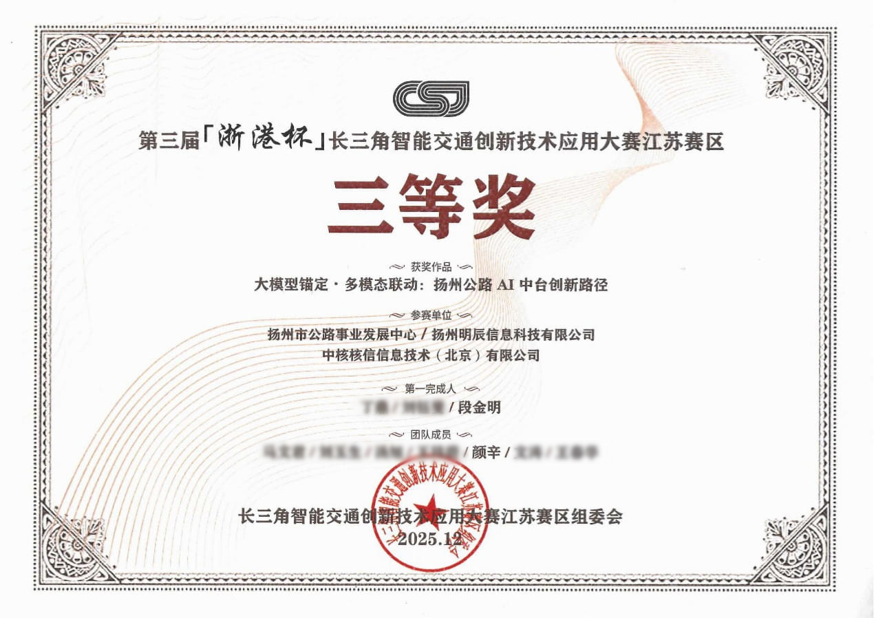 喜报!扬州公路AI中台荣膺第三届「浙港杯」长三角智能交通创新技术应用大赛三等奖!作为聚焦智能交通领域创新发展的重要赛事,「浙港杯」长三角智能交通创新技术应用大赛汇聚了长三角地区智能交通领域的顶尖企业、科研机构与创新团队,赛事评审严格围绕技术创新性、应用可行性、行业影响力等核心维度展开,是行业创新实力的重要展示平台。此次获奖,不仅是对项目技术水平与创新价值的高度认可,更是对我司在智能交通领域技术沉淀与实践能力的有力佐证。 本次参赛的扬州公路AI中台创新路径,以大模型锚定为核心支撑,构建多模态联动的智能交通服务体系,精准贴合公路交通管理的实际需求。项目深度融合人工智能、大数据、... -